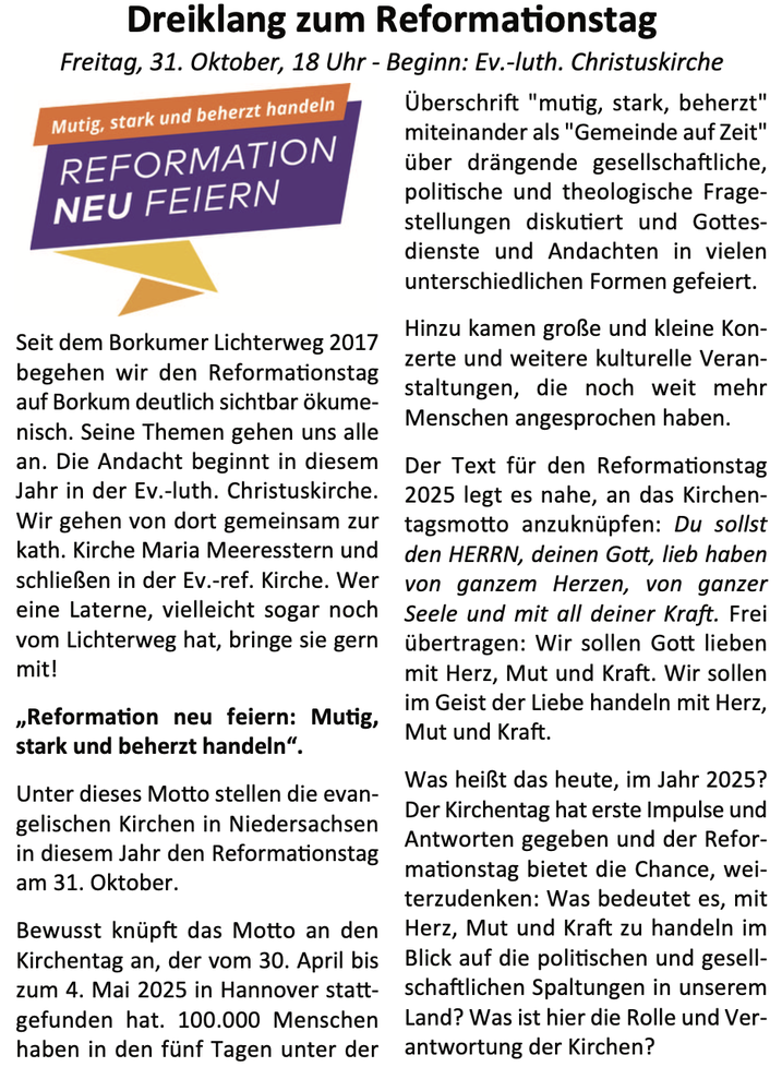 Die Ökumene auf Borkum lädt im Reformationssommer 2017 zu Vortrags- und Gesprächsabenden ein, die im vierzehntägigen Abstand stattfinden. Es werden jeweils reformatorische Persönlichkeiten vorgestellt, ein kurzer zentraler Text gelesen und anschließend darüber diskutiert.